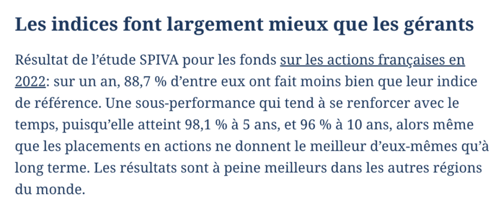Vous pensez que les experts des grandes banques ou fonds d’investissement font mieux que nous ? Détrompez-vous. Les statistiques montrent que 88,7 % des gestionnaires de fonds sous-performent leur indice de référence. Ce pourcentage atteint même 98 % à 5 ans.